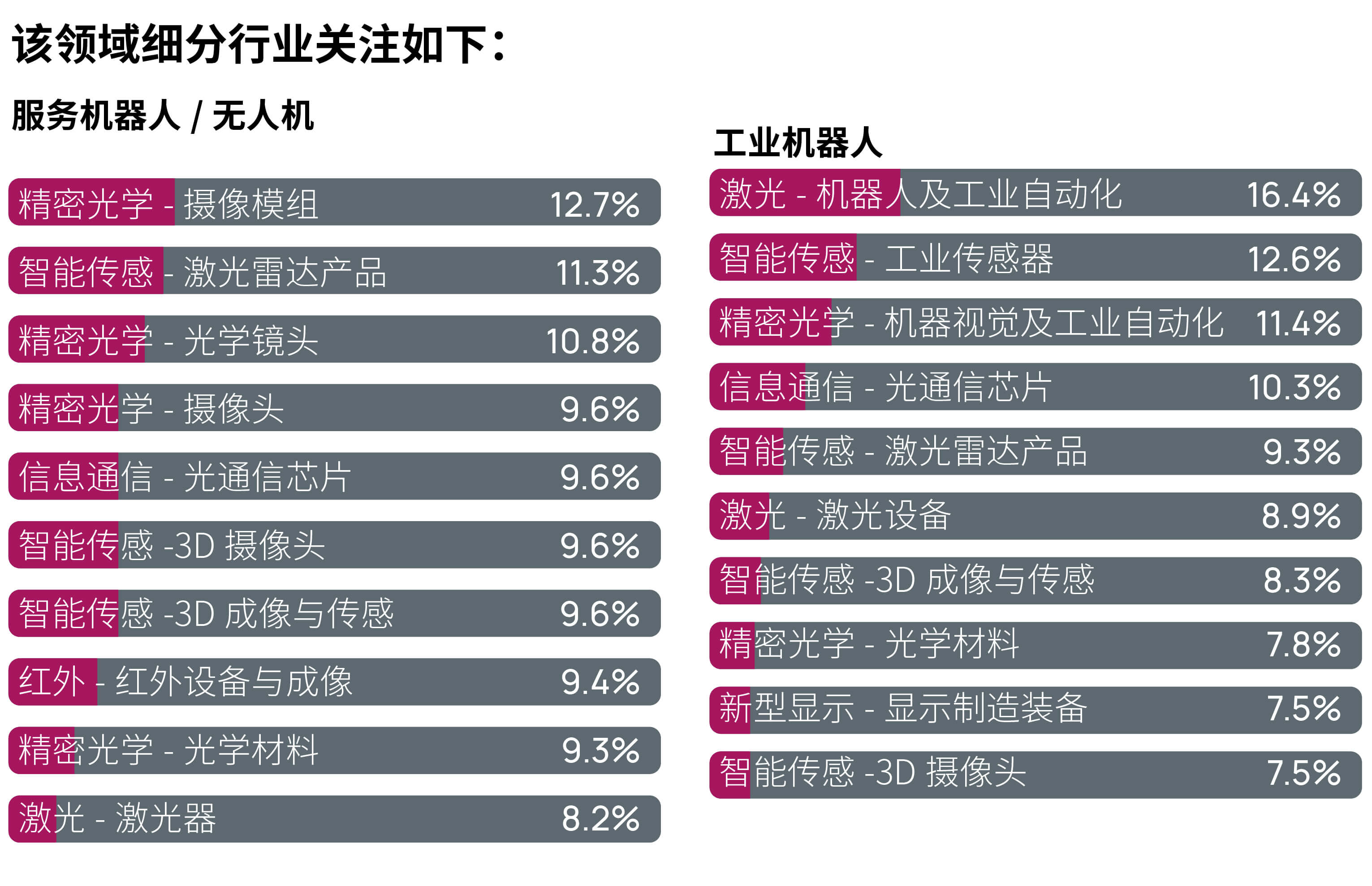 針對光電在機器人行業(yè)的應(yīng)用,根據(jù)重點展示范疇制作了產(chǎn)業(yè)鏈圖